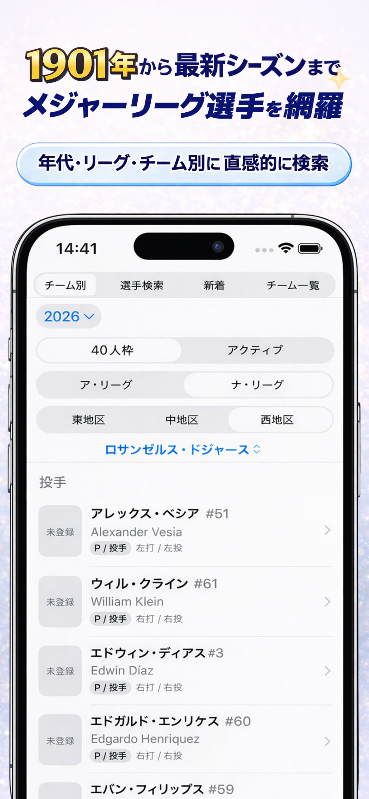 メジャーリーグの歴史から最新シーズンまで、選手データやトリビアを楽しみながら深掘りできます。観戦がもっと楽しくなる図鑑です。